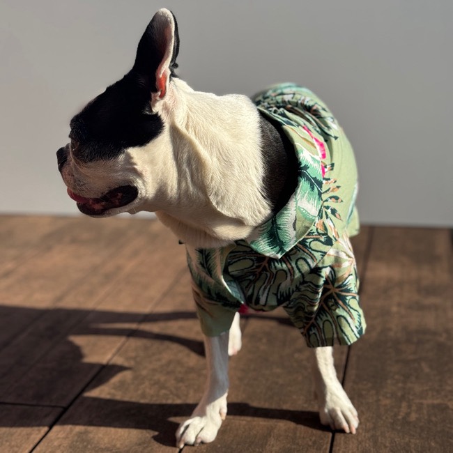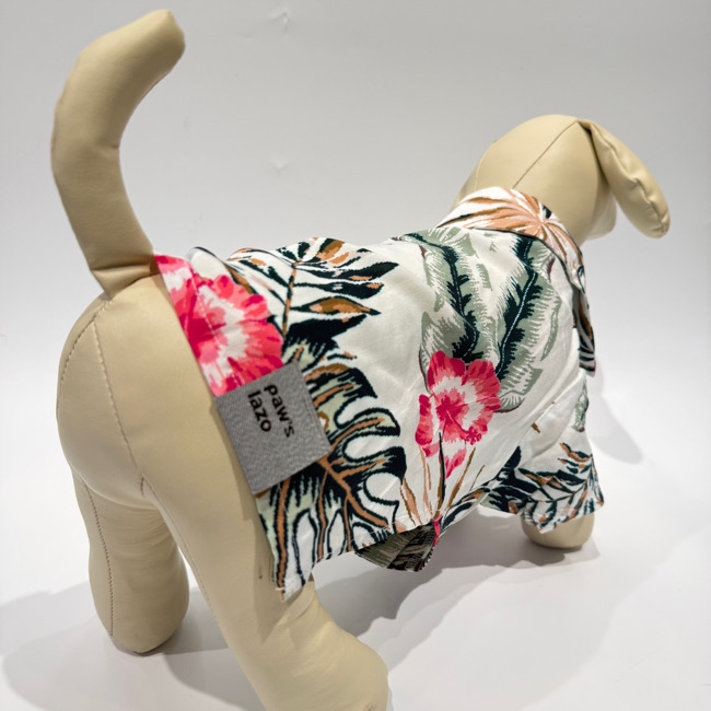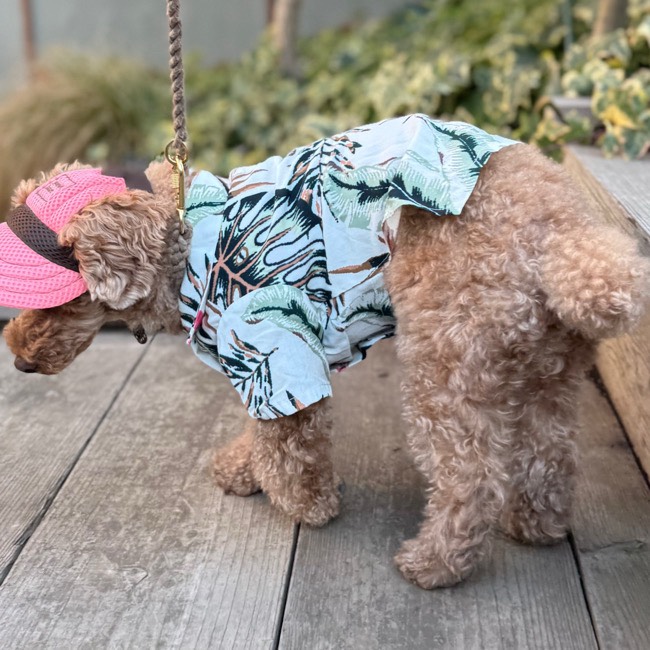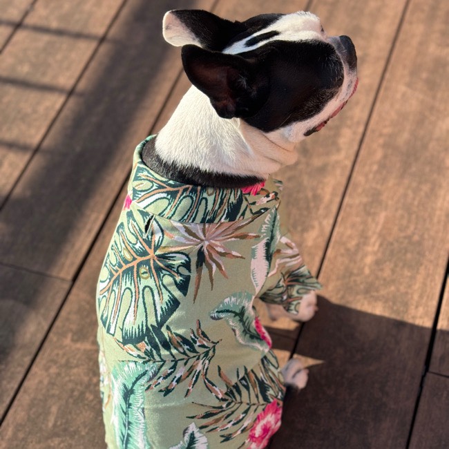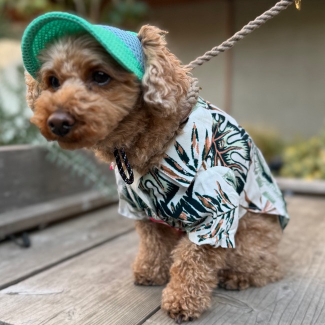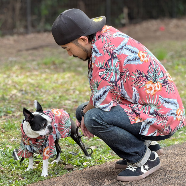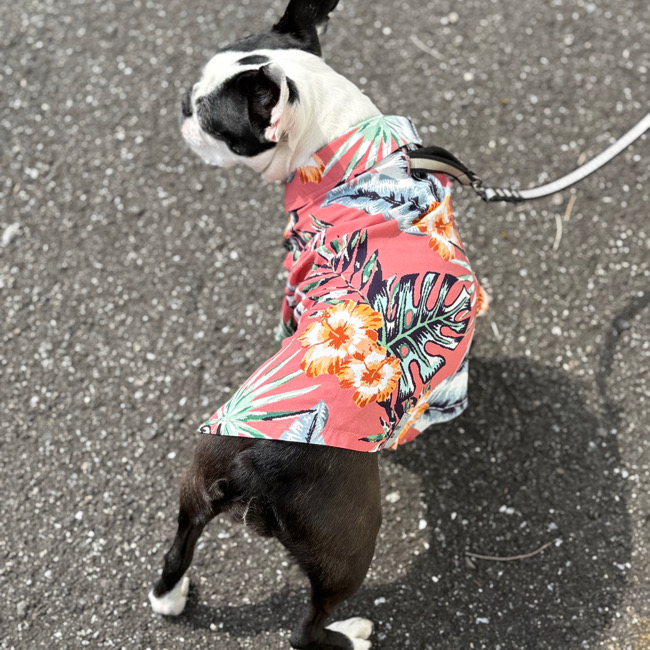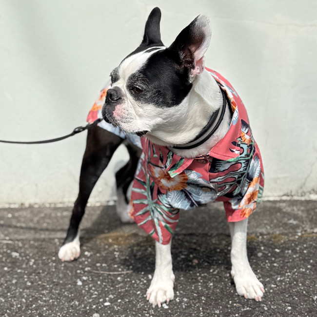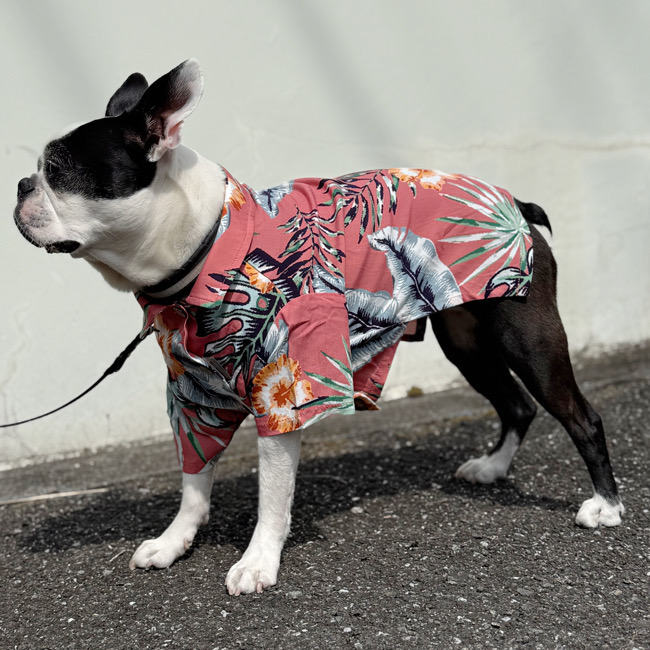 とろみのあるレーヨン素材のアロハシャツはリゾートムードたっぷりに。 第一釦より下はマジックテープで着脱が簡単です。 オーナーとリンクコーデで夏を満喫! モデル体重 Toy poodle 4㎏ 着用サイズM Boston terrier 7㎏ 着用サイズXL