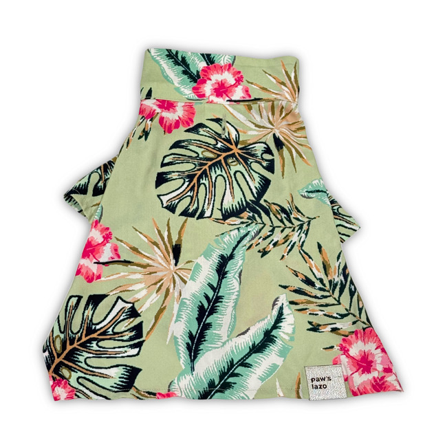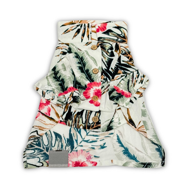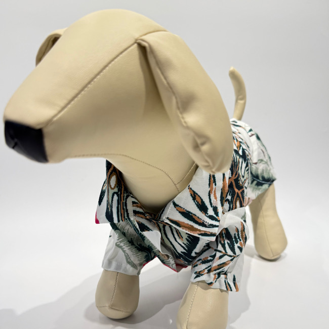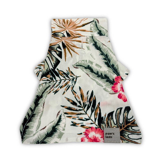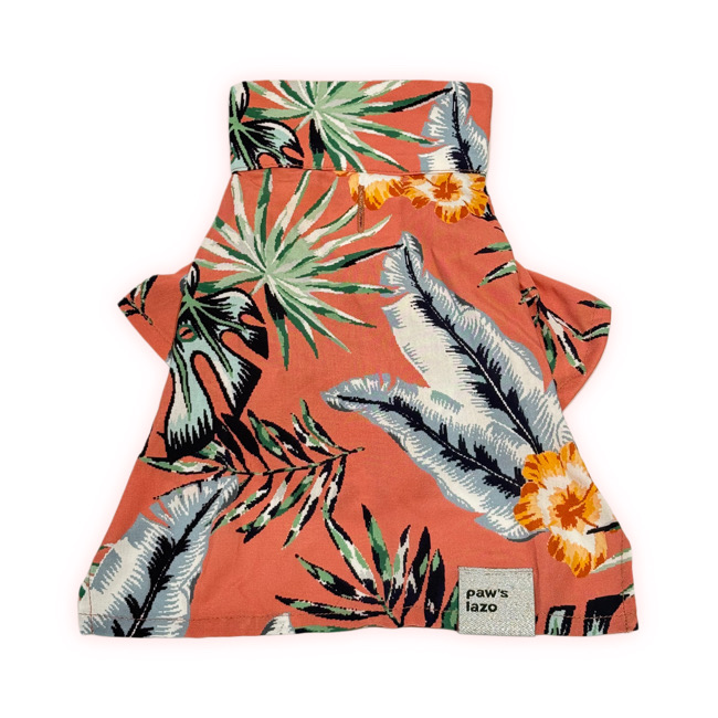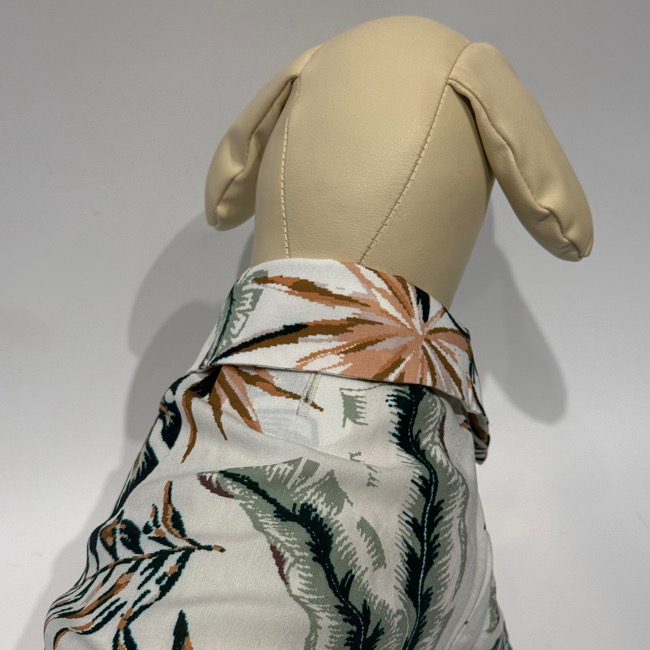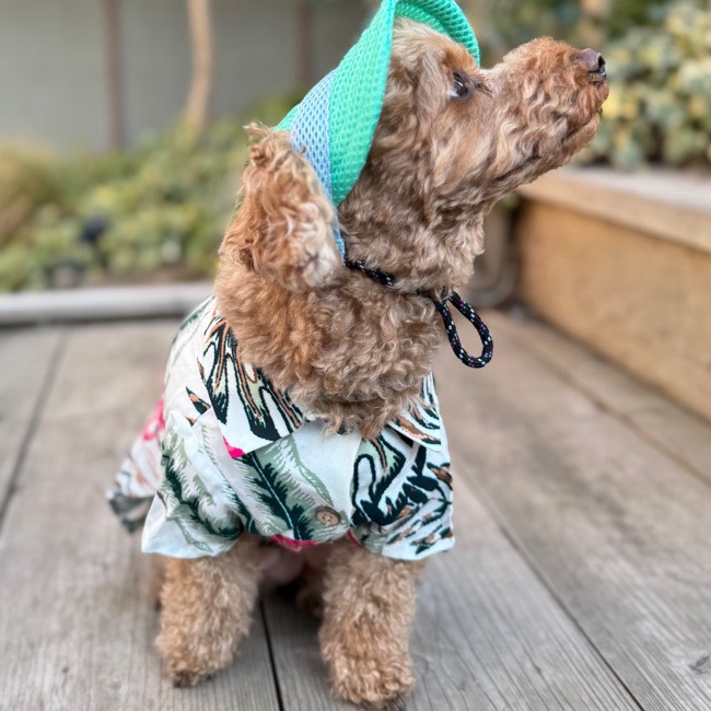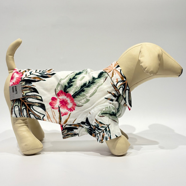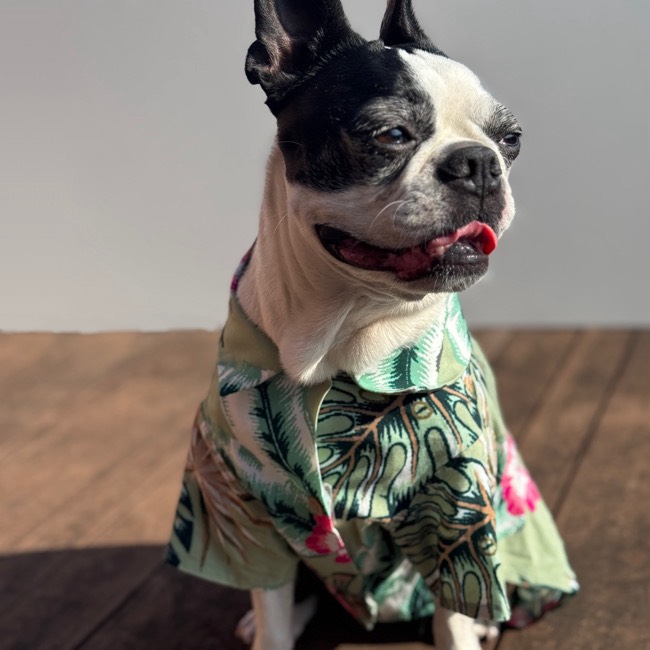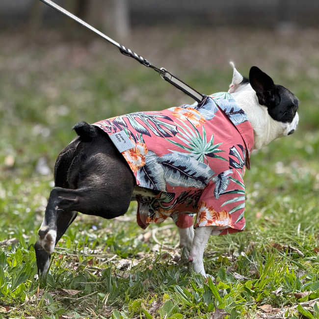 とろみのあるレーヨン素材のアロハシャツはリゾートムードたっぷりに。 第一釦より下はマジックテープで着脱が簡単です。 オーナーとリンクコーデで夏を満喫! モデル体重 Toy poodle 4㎏ 着用サイズM Boston terrier 7㎏ 着用サイズXL