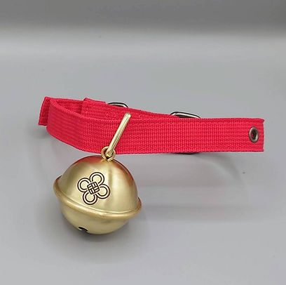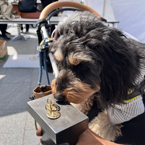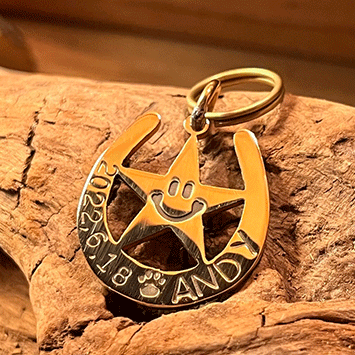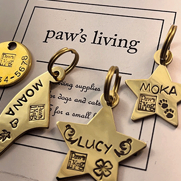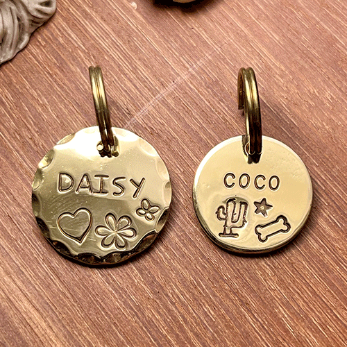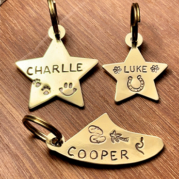 ゴールドカラーの真鍮にペットのお名前や電話番号などを刻印し、
